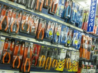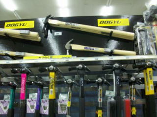 | 壁面の工具箱のコーナー。やや乱雑気味。統一感が無いからだろうか?メーカー別・大きさ別・仕様別・素材別・縦陳列・横陳列など仕掛け方はいくらでもある。また破損したり紛失したりするバックルを関連陳列したい | 土牛の仮枠用ハンマーの陳列。これはよい、がもう一歩踏み込んで仮枠ハンマーの特徴のワンポイントPOPが欲しい。「柄が長いのは高い所の釘を叩いたりクサビを締めたりする為」とか「釘抜き側が鋭いのはバタ角に突き刺して引き上げる為」とか他店と差別化のPOPを設置したいなぁ | ペンチの老舗のフジ屋 | ||