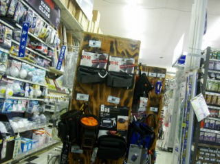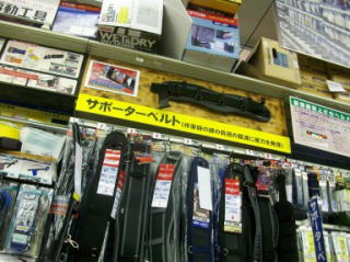 こちらはサポーターベルトの見本。これも位置が高い為、目立たない。やはり目線の高さに設置して、触ってもらって使用感を確認してから購入に繋げたい | 通路にあったポーチ類の移動什器。暖かくなると男性陣は財布や携帯の収納場所に困るので、こういったポーチ類の売り上げはバカにできない | ||