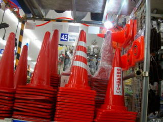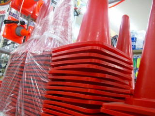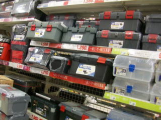 | 工具コーナー入り口の三角コーンの売り場 | 単管でやぐらを組んで陳列。現場チックを演出。ボリュームや演出など良いのだが、果たして三角コーンを一等地の表エンドで展開はありだろうか? | かなり乱雑だった工具箱コーナー。通路に売り場に入りきらない工具箱が放置されていた | ||
